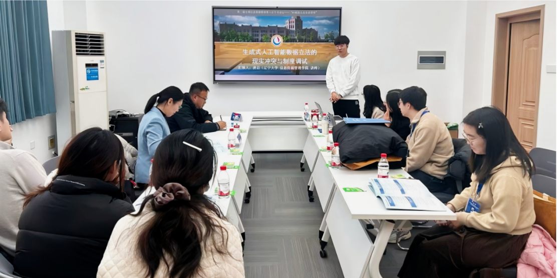 在下午的“AI技术驱动的信息资源管理理论与方法创新”分论坛中,唐启作了题为“生成式人工智能数据立法的现实困境与制度调试”的报告,立足生成式人工智能“数据输入——模型运算——内容输出”的三个环节,并针对与之对应的“训练数据、中间数据、生成数据”三种数据类型,分析其中所蕴含的现实冲突与法律的破解之道。